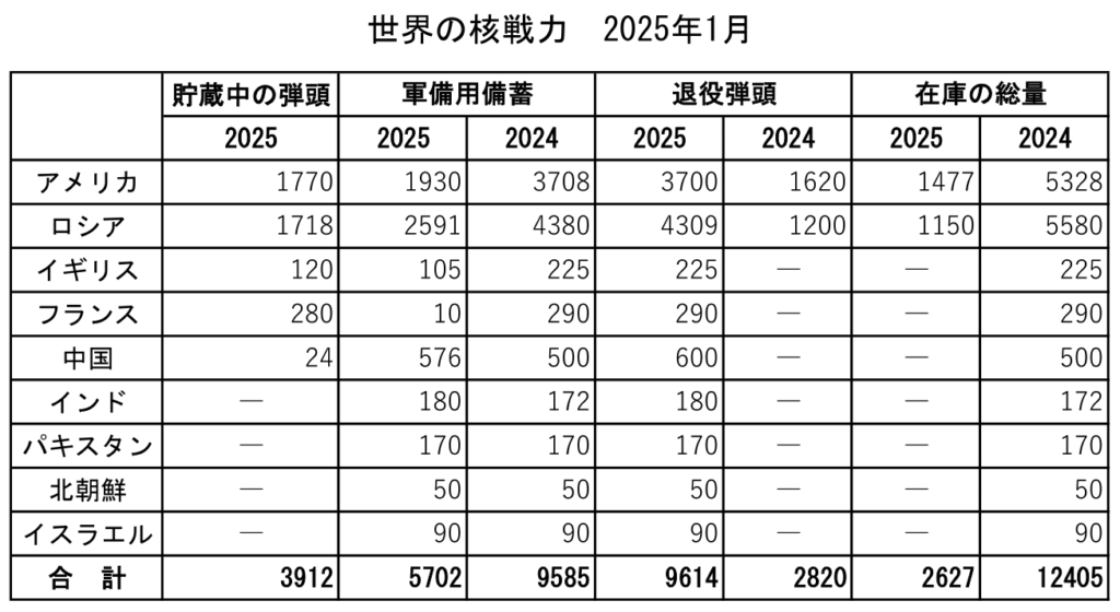 同報告書は核兵器の現状について、2025年1月現在▽世界全体で推計約1万2400発の核弾頭が備蓄されていた▽そのうち9600発余は使用可能な状態で軍事用貯蔵されていた▽うち約3900発はミサイルおよび航空機に配備され、その他は中央貯蔵庫に備蓄されていた▽配備されている弾頭のうちおよそ2100発は、弾道ミサイルに搭載されて「高度作戦警戒態勢」におかれていると指摘。これらの弾頭のほとんどすべてが、ロシアあるいは米国のものであったが、中国も平時、ミサイルに若干の弾頭を搭載しているかもしれない▽ロシアと米国は、すべての核兵器の約9割を保有していて、核保有の上限を決める新しい協定に合意できなければ両国が戦略ミサイルに配備する弾頭の数は新START(戦略攻撃兵器の削減・制限に関する2010年の米ロ条約)が26年2月に失効すれば増大する可能性があると分析しています。