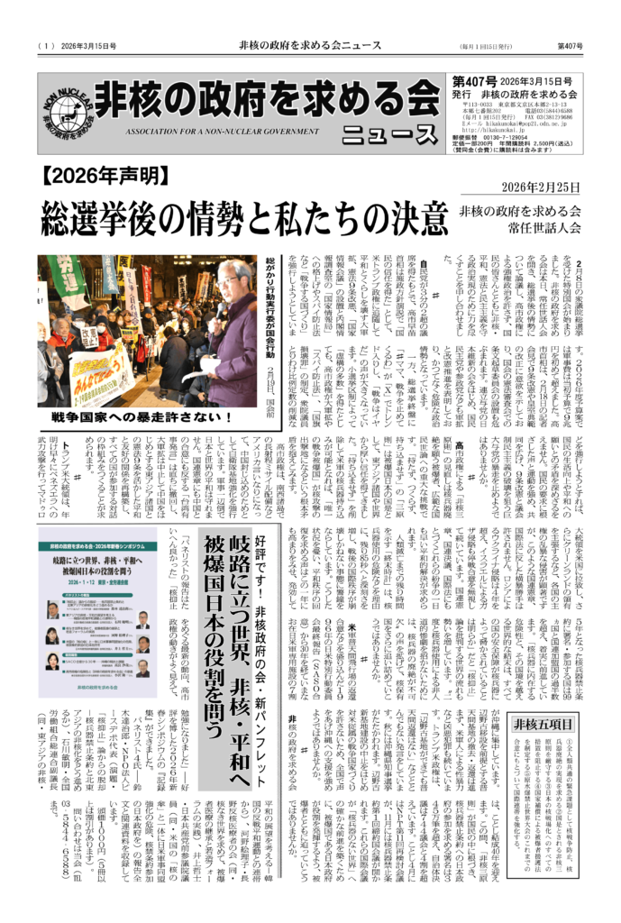 1面は、非核の政府を求める会の2026年声明「総選挙後の情勢と私たちの決意」を掲載。